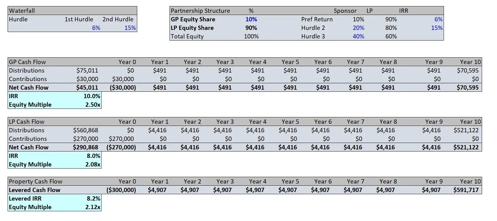 All equity waterfalls are different and the partnership agreement will outline each deal’s specific investment structure. Some waterfalls have dozens of complicated hurdles and provisions, but the overall hierarchy and concepts remain somewhat the same. GP’s will typically receive a larger percentage of the total cash flows upon reaching higher hurdles.