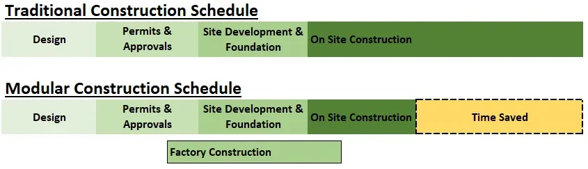 Save Time: The factory can build modules concurrently as site and foundation work is underway. Traditional construction can not begin until site and foundation work is completed.